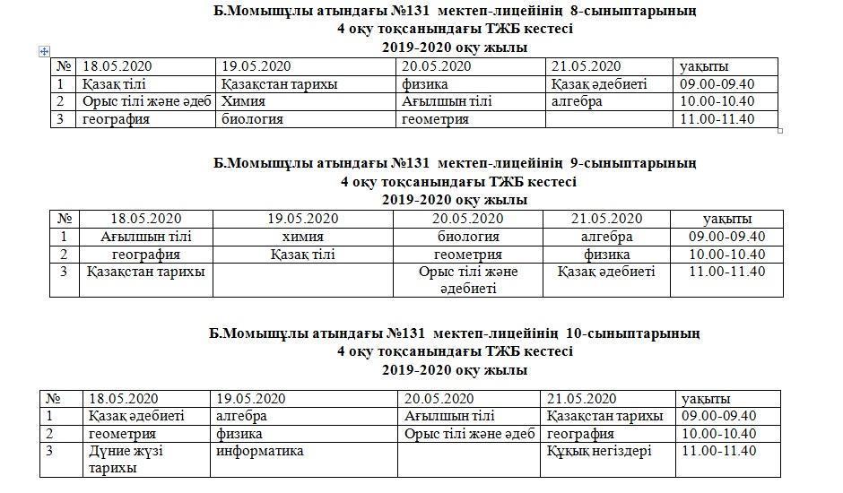 13 май 2020 0 1 2 3 4 5 Б.Момышұлы атындағы №131 мектеп-лицейінің 4 оқу тоқсанындағы ТЖБ кестесі Осы беттің QR-коды:QR-код этой страницы: