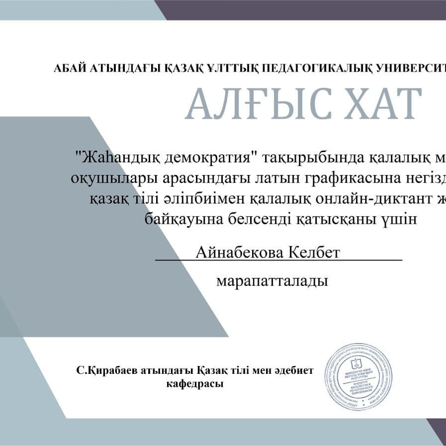 "Жаһандық демократия" тақырыбында қалалық мектеп оқушылары арасындағы латын графикасына негізделген қазақ тілі әліпбиімен қалалық онлайн-диктант жазу байқауына қазақ тілі мен әдебиеті пәнінің мұғалімі Келденова Гаухар Кабдешовнаның жетекшілігімен 9 Ә және 9 А сынып оқушылары қатысып жүлделі орындарға ие болды.Шәкірттерімізді құттықтай отырып, оқуда озат, Отанымызға қосар үлестеріңіз көп болсын дей отырып, ардақты ұстазымыз - Гаухар Кабдешовнаға шексіз алғыс білдіреміз. Әрқашанда, шәкірттеріңіз биіктен көрініп, еңбегіңіз жана берсін!