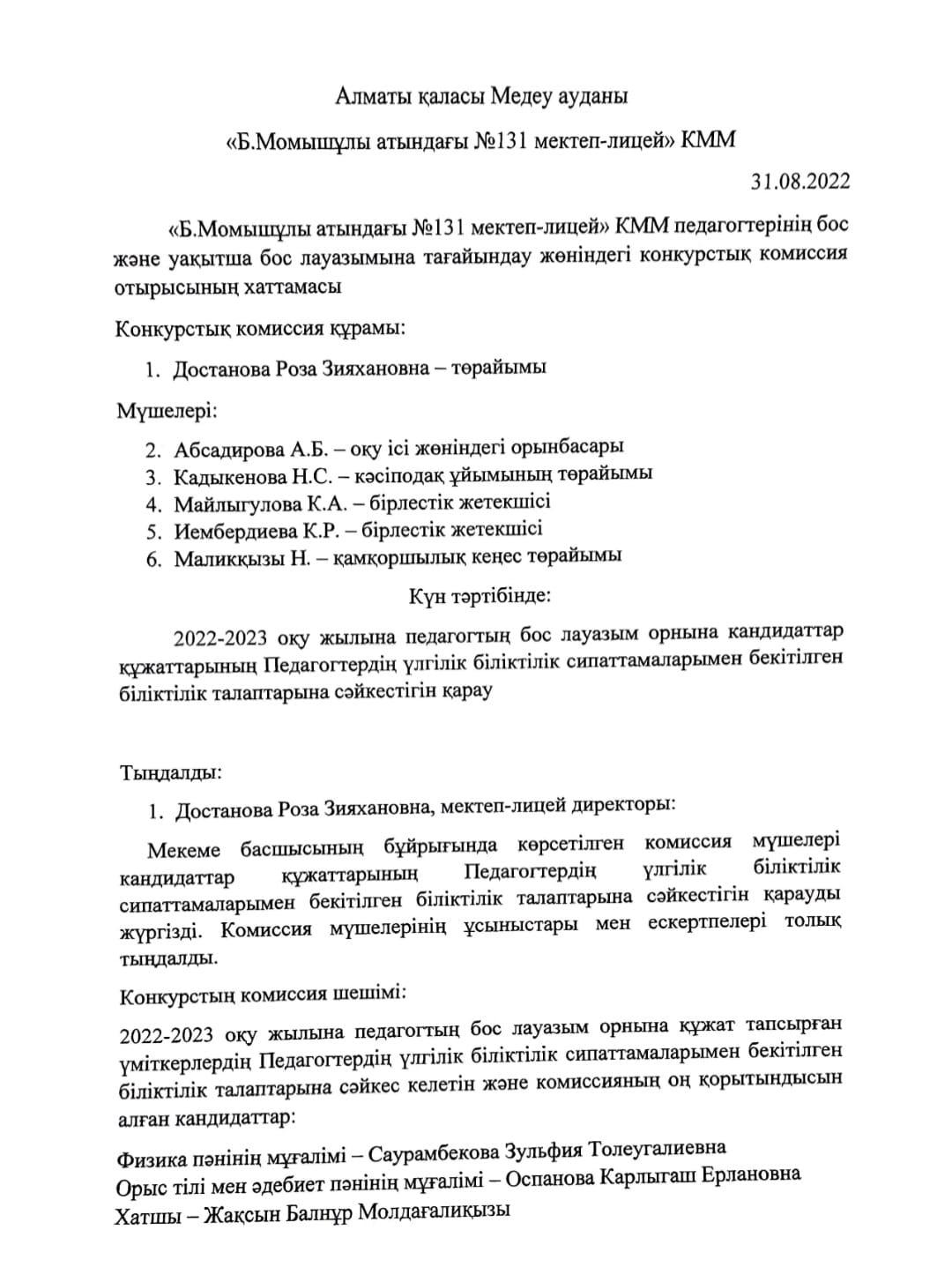 "Б.Момышұлы атындағы №131 мектеп-лицей" педагогтерінің бос және уақытша бос лауазымына тағайындау жөніндегі конкурстық комиссия отырысының хаттамасы