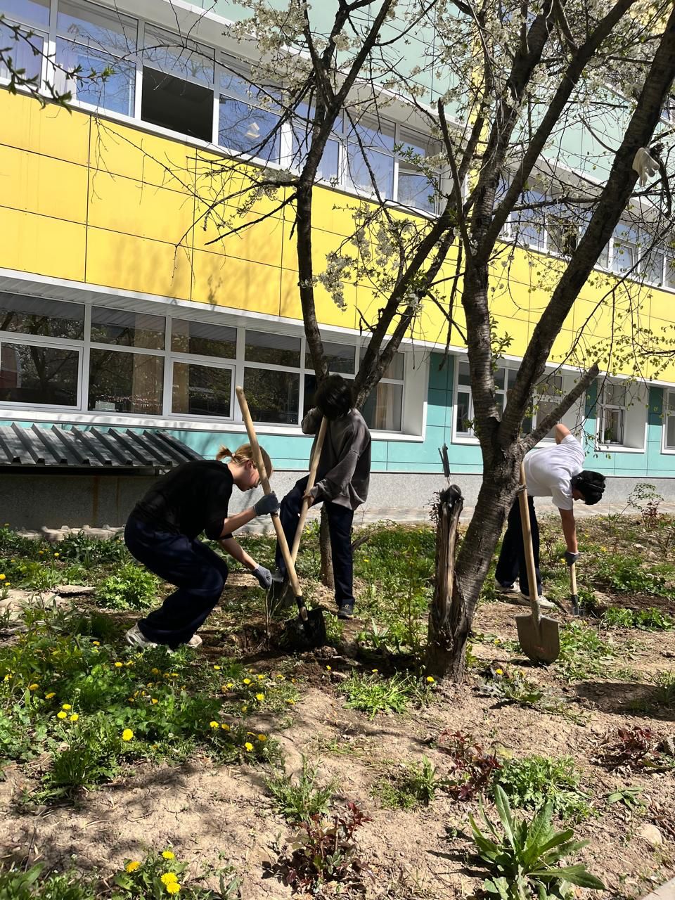 9 «Е» класс в рамках экочелленджа «Посадка деревьев выпусниками» посадили розы и сирень на территории школы.