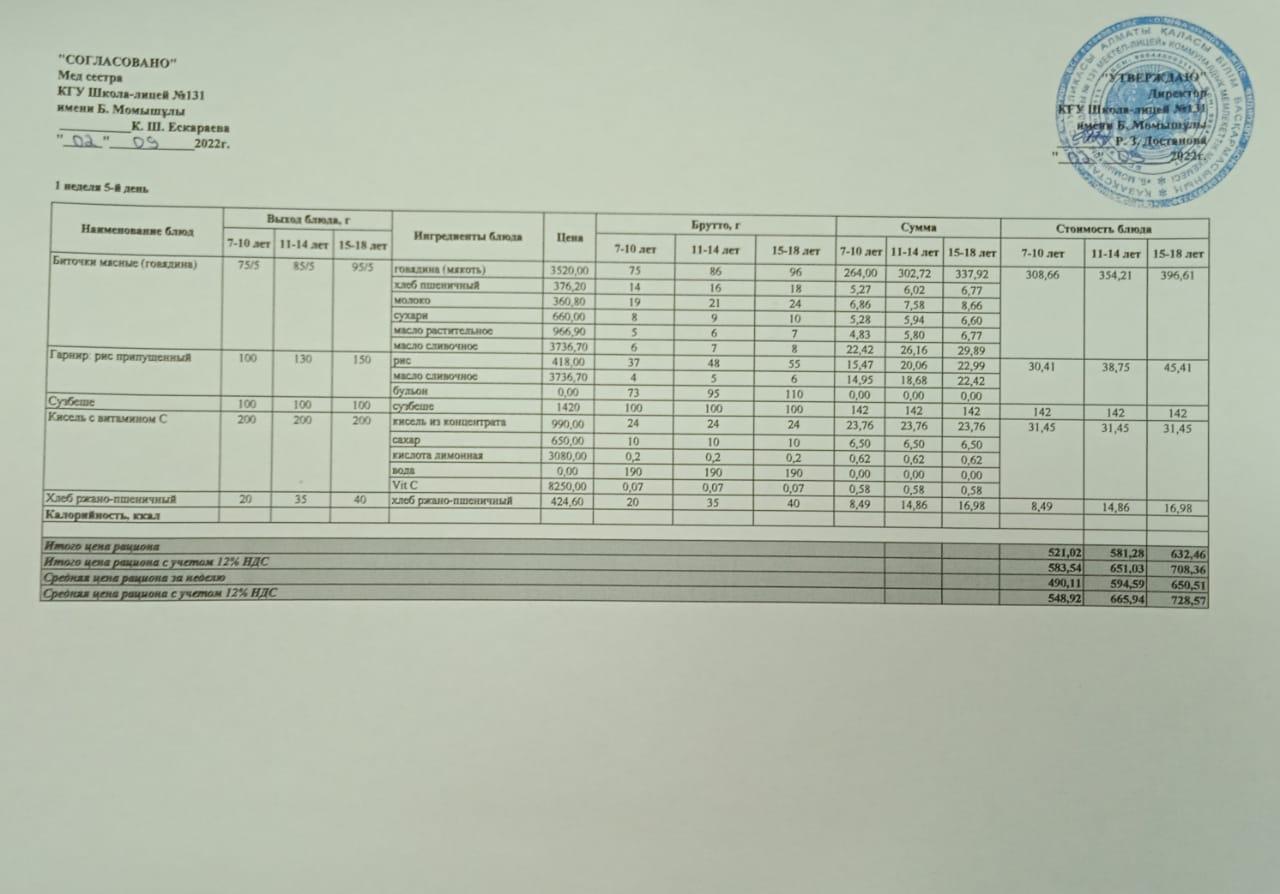2021-2022 оқу жылы Қыс-көктем ас мәзірі 1-апта. Меню Зима-весна